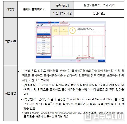 ‘AiTiAMI’는 인공지능으로 ‘12 채널 유도 심전도’ 데이터를 분석해 급성심근경색의 가능성을 점수(0~100점)와 위험도(저위험군, 중위험군, 고위험군)를 표시해 급성심근경색을 선별함으로써 의료진의 진단 결정을 보조하는 국내 첫 제품으로 기술혁신성 등을 인정받아 통합심사를 거쳐 혁신의료기기로 지정됐다.