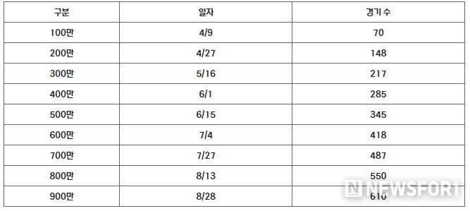 SSG도 95만 1,776명을 동원해 100만 관중을 눈앞에 두고 있으며, 롯데도 홈 56경기를 치른 현재 93만 5,869명을 기록하고 있어 100만 관중 돌파가 유력해 6개 구단이 100만 관중을 넘길 수 있을 전망이다.