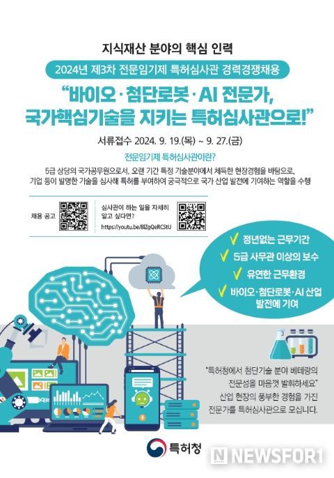 뉴스포원(NEWSFOR1) 윤경덕 기자 | 특허청은 국가전략기술 분야 우리 기업의 특허 경쟁력 강화를 위해 바이오(35명), 첨단로봇(16명), 인공지능(9명) 등 세 분야에서 총 60명의 전문임기제 특허심사관(5급상당)을 채용한다고 밝혔다. 앞서 특허심사관 채용을 완료한 반도체, 이차전지 분야에 이어 바이오·첨단로봇·인공지능 분야에서도 우리 기업의 빠른 특허 확보가 가능해질 것으로 기대된다.