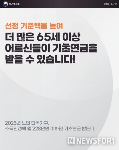 뉴스포원(NEWSFOR1) 윤경덕 기자 | 2025년 노인 단독가구, 소득인정액 월 228만 원 이하면 기초연금 받습니다. 더 많은 65세 이상 어르신들이 기초연금을 받을 수 있습니다!