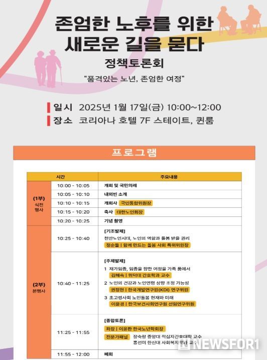 뉴스포원(NEWSFOR1) 윤경덕 기자 | 대통령 직속 국민통합위원회는 1월 17일 10시 코리아나 호텔에서 대한노인회, 한국노년학회와 함께 '존엄한 노후를 위한 새로운 길을 묻다'라는 주제로 정책토론회를 개최했다.