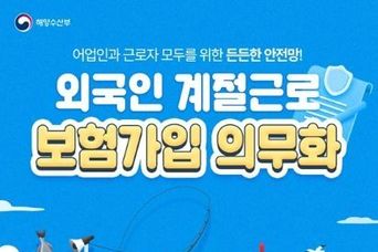 뉴스포원(NEWSFOR1) 편집국 기자 | 어업인과 근로자 모두를 위한 든든한 안전망! 외국인 계절근로 보험가입 의무화 1. 임금체불 보증보험 Q. 무엇을 보장하나요? - 임금 미지급 발생 시 근로자의 생계 보호 Q. 누가 가입하나요? - 어업인(고용주) Q. 언제 가입하나요? - 근로계약 체결 후 30일 이내 Q. 어떻게 가입하나요? - 지자체 안내에 따라 가입(추후 안내) 2. 어업인 안전보험 Q. 무엇을 보장하나요? - 어업작업 중 발생하는 상해·질병보상 ※ 사망·장해 발생 시 최대 1.2억 원 보장 Q. 누가 가입하나요? - 어업인(고용주) Q. 언제 가입하나요? - 재입국: 근로 시작 이후 15일 이내 - 신규입국: 외국인 등록 이후 15일 이내 Q. 어떻게 가입하나요? 전국 지역 수협에 고용주가 직접 방문 가입 ※ 준비물: 외국인등록증, 근로계약서 사본, 사업자등록증 또는 고용허가서 등 3. 상해보험 Q. 무엇을 보장하나요? - 일상생활 중 발생하는 상해·질병 보상 ※ 상해사망: 최대 30