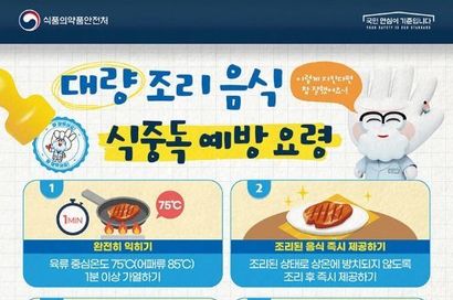 뉴스포원(NEWSFOR1) 편집국 기자 | ■ 대량 조리 음식 식중독 예방요령 ① 완전히 익히기 육류 중심온도 75°C(어패류 85°C) 1…