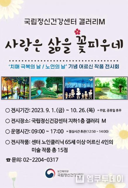 엠쿠투데이 편집국 기자 | 국립정신건강센터(센터장 곽영숙)는 9월 1일부터 10월 26일까지 지하 1층 전시관 ‘갤러리 M’에서 노인 환자 작품 전시회 『사랑은 삶을 꽃피우네』를 개최한다.
