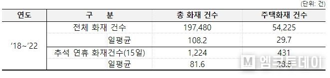 소방청 국가화재시스템 통계에 따르면 지난 5년('18~'22) 추석 연휴 기간 전국에서 발생한 화재는 총 1,224건으로 이 가운데 431건(35.2%)는 주거시설에서 발생한 것으로 나타났다. 3건중 1건은 주거시설에서 발생한 셈이다.