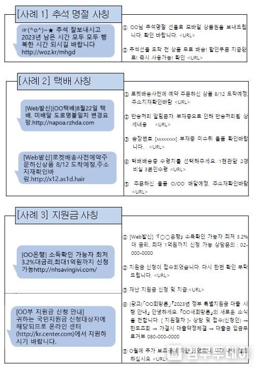 최근 3년간 스미싱 피해 현황을 분석해 보면 택배 배송 사칭 유형이 28만여 건으로 전체의 약 65%를 차지하고 있는데, 이번 추석 명절에도 명절기간을 전후하여 가족 친지, 지인 간 선물배송이 증가하는 상황을 악용하는 스미싱 문자가 다량 유포될 수 있어 국민들의 각별한 주의가 요구된다.