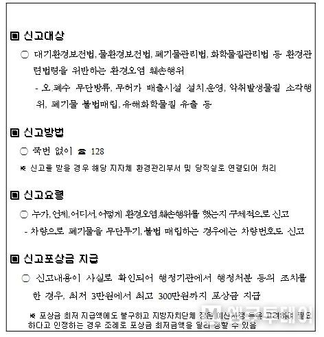 한준욱 환경부 환경조사담당관은 “추석 연휴기간 중 불법 환경오염행위가 발생되지 않도록 환경감시 체계를 구축하고, 감시·단속을 강화하여 국민들이 안심하고 추석 연휴를 보낼 수 있도록 최선을 다할 계획”이라고 밝혔다.