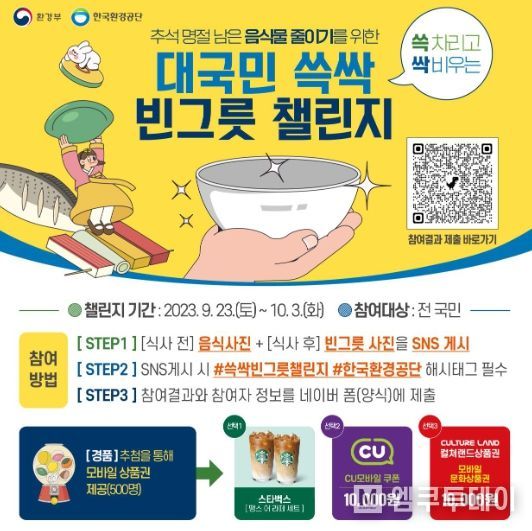 엠쿠투데이 편집국 기자 | 환경부 산하 한국환경공단(이사장 안병옥)은 추석 명절을 맞아 9월 23일부터 10월 3일까지 낭비 없는 음식문화를 조성하고 생활 속 실천을 유도하기 위한 ‘쓱싹 빈그릇 도전(챌린지)’ 행사를 실시한다고 밝혔다.