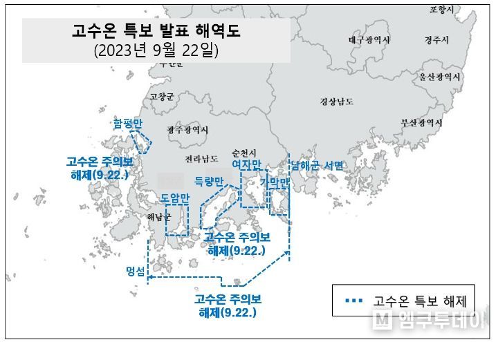 엠쿠투데이 편집국 기자 | 해양수산부는 9월 22일 14시부로 전남 연안 및 내만에 발표됐던 고수온 특보(주의보)를 전면 해제한다고 밝혔다.