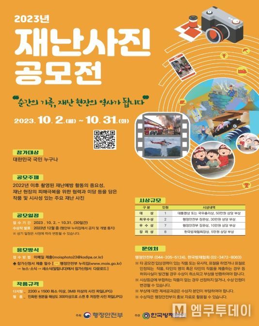 엠쿠투데이 편집국 기자 | 행정안전부는'2023년 재난사진 및 재난예방 포스터 공모전'을 10월 2일부터 31일까지 개최한다고 밝혔다.