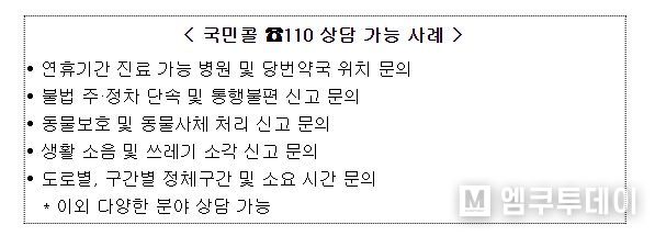 또 불법 주·정차 단속 및 통행불편 신고 문의, 행정기관 업무 관련 일반 상담, 전기·수도 고장, 학교폭력 등 각종 비긴급 신고상담도 가능하다.