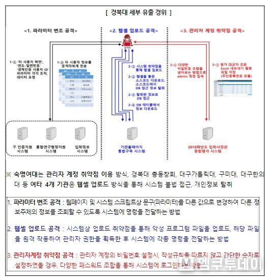 작년 11월 경북대학교 측으로부터 개인정보 유출신고를 접수받아 조사한 결과, 경북대학교 소속 학생 2명이 ’21.8월부터 학교 시스템 보안 취약점을 악용해 파라미터 변조(매개변수 위조), 웹셸(악성코드) 업로드, 관리자계정 취약점(비밀번호 관리 소홀) 이용 등 다양한 방법으로 여러 시스템에 무단 접속했고 이후 유사한 방법으로 학교 관련 단체나 주변 대학으로 공격 범위를 확대해 나간 사실을 확인했다.
