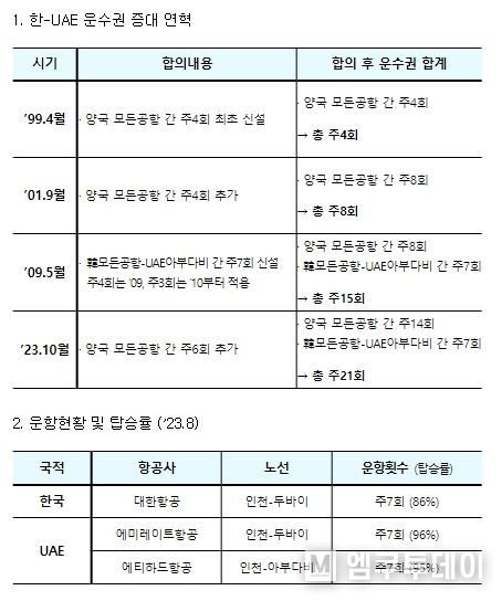 이번 양국간 합의로 한-UAE간 운수권은 기존 주15회에서 주21회로 총 주6회가 증대되어, 양국간 인적·물적 교류 기회가 더욱 넓어질 전망이다.
