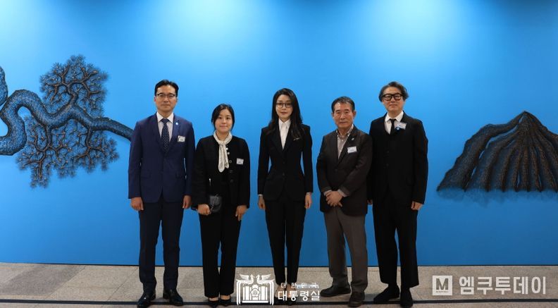 자리에 함께한 나형민 작가는 대통령 부부와 반려견이 담긴 사진을 인공지능이 학습해 수묵화로 표현한 ‘AI 수묵화’(전통 수묵과 AI 첨단기술을 융합한 작품)를 김 여사에게 기념으로 전달했다.