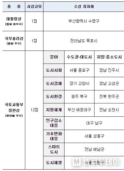 올해는 ‘도시의 지속가능성 및 생활인프라 수준’과 우수사례를 평가하여 14곳의 도시(대통령상 1, 국무총리상 1, 장관상 12)를 선정했다.
