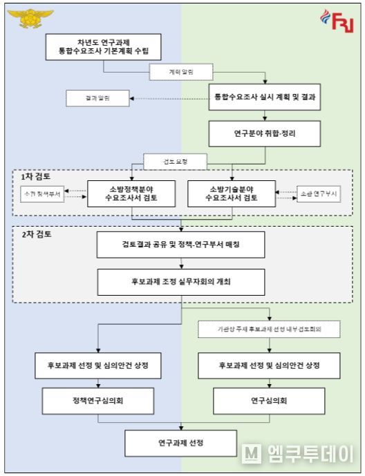 접수된 수요 조사서는 1차로 중복성, 실현 가능성 등을 자체적으로 검토하고, 2차로 정책부서와 연구부서 간 실무 조정회의를 통해 유사분야 연구를 조정·통합하여 후보 과제를 선정하며, 이후 소방청 정책연구심의회와 국립소방연구원 연구심의위원회의 심의를 통해 2024년 연구과제로 최종 선정한다.