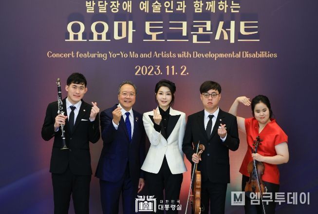 엠쿠투데이 윤경덕 기자 | 김건희 여사는 11월 2일 용산 대통령실 파인그라스에서 발달장애를 가진 예술꿈나무 연주자들과 첼리스트 요요마(Yo-Yo Ma)가 함께한 토크콘서트에 참석했다. 김 여사는 지난 4월 하트 시각장애인 체임버 오케스트라 특별공연과 9월 한빛예술단 창립 20주년 기념음악회를 관람하는 등 장애 예술인들의 문화예술 활동을 응원하고 있다.