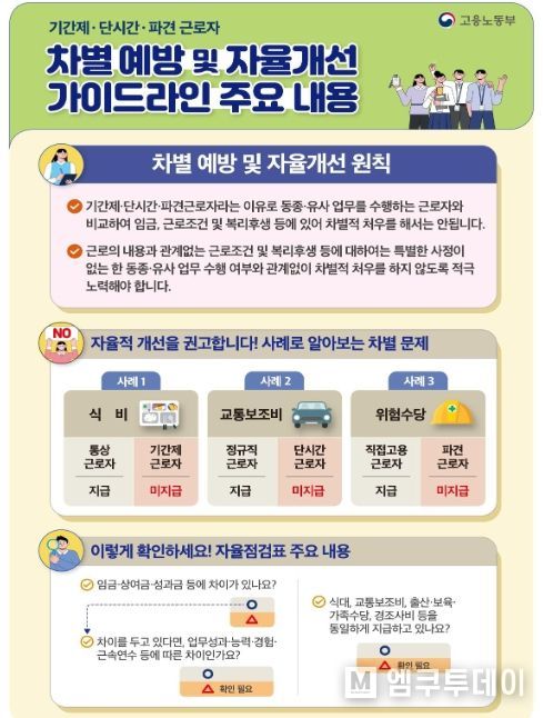 가이드라인은 사용자가 차별 문제를 스스로 점검, 자율적으로 개선할 수 있도록 사용자가 기본적으로 준수하거나 노력해야 할 사항을 안내하고 있다. 가이드라인에는 차별 예방을 위한 기본원칙, 구체적인 사례를 통한 권고 사항과 사업장 자율점검표 등이 포함되어 있다. 특히, 공정과 상식에 기반한 노동시장 약자 보호를 위해 ‘근로의 내용과 관계없는 복리후생적 처우는 특별한 사정이 없으면 동종·유사 업무 수행 여부와 관계없이 차별하지 않을 것’을 적극적으로 권고하고 있다.