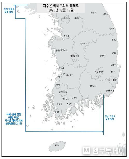 엠쿠투데이 윤경덕 기자 | 해양수산부는 12월 19일 14시부로 서·남해 연안(내만 포함)에 저수온 예비주의보가 발표됨에 따라, 저수온 위기경보 「주의」단계를 발령했다.