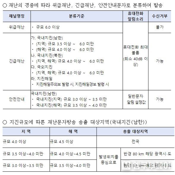 현재는 지역에서 지진 규모 3.0 이상이 발생하면 관련 규정에 근거하여 재난의 경중에 따라 위급재난, 긴급재난, 안전안내문자로 구분하고, 지진의 발생 위치를 중심으로 해당 광역시·도 단위로 지진 재난문자를 송출하게 되어 있다.