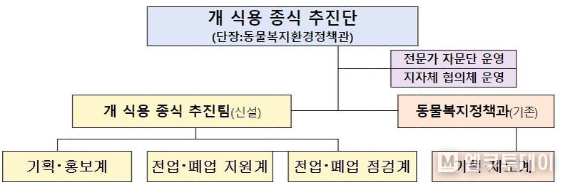 ‘개 식용 종식 추진단’은 농식품부 동물복지환경정책관을 단장으로 농식품부·산하기관·지자체·전문가 등으로 구성된 ‘개 식용 종식 추진팀’을 신설하고, 그동안 「개 식용 종식 로드맵」 마련 및 「개 식용 종식 특별법」 제정 등을 추진한 동물복지정책과도 포함시켰다.