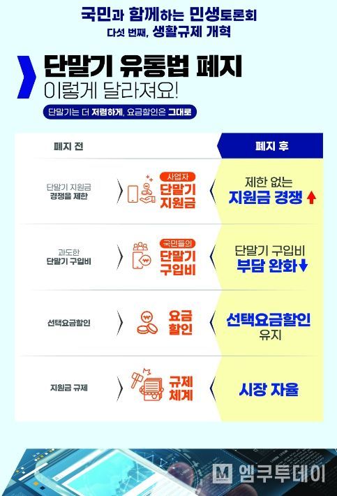 정부는 통신사, 유통점간 자유로운 지원금 경쟁을 촉진하고, 국민들이 저렴하게 휴대전화 단말을 구입할 수 있는 기회를 제공하기 위해 현행 '이동통신단말장치 유통구조 개선에 관한 법률(이하 ‘단말기 유통법’)'을 전면 폐지하기로 했다.
