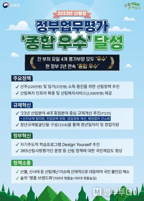 엠쿠투데이 윤경덕 기자 | 산림청은 45개 중앙행정기관 대상 2023년 정부업무평가에서 기관 종합평가 ‘우수’에 선정되는 영예를 차지했다고 밝혔다.