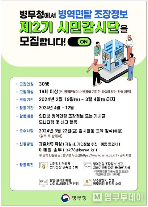 엠쿠투데이 윤경덕 기자 | 병무청은 온라인상의 병역면탈 조장정보를 차단하여 공정한 병역이행 문화를 조성하기 위해 ‘제2기 병역면탈 조장정보 시민감시단’을 공개 모집한다.
