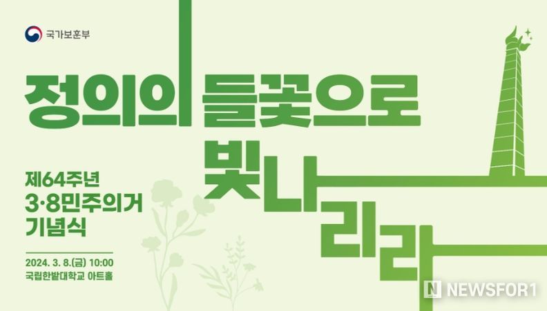 뉴스포원(NEWSFOR1) 윤경덕 기자 | 국가보훈부는 1960년 대전지역 학생들이 중심이 되어 일어난 충청권 최초의 민주화 운동인 3·8민주의거를 기억하고 그 정신을 계승하기 위한 ‘제64주년 3·8민주의거 기념식’을 8일 오전 10시 국립한밭대학교(아트홀, 대전광역시 유성구)에서 거행한다고 밝혔다.
