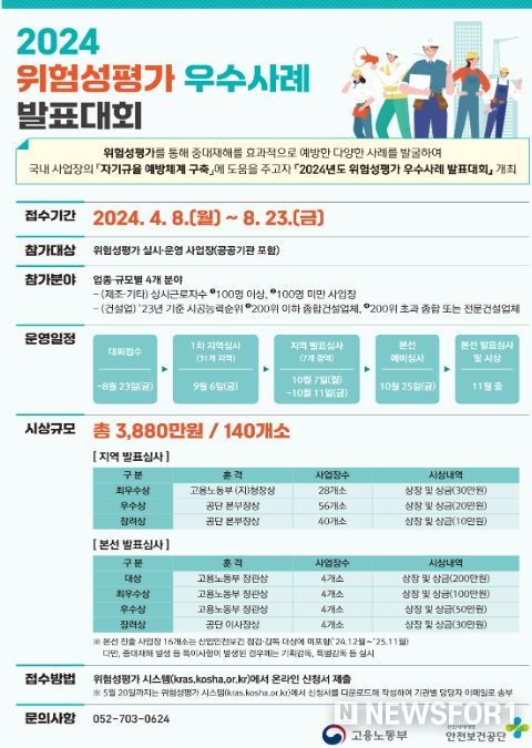 뉴스포원(NEWSFOR1) 윤경덕 기자 | 고용노동부와 안전보건공단(이사장 안종주)은 오는 8일부터 8월 23일까지 위험성평가 우수사례를 공모한다. 위험성평가란 노사가 함께 사업장의 유해위험요인을 찾고 개선하는 과정으로 가장 효과적인 산재예방 활동이다. 우수사례를 제출한 기업은 10월 지역 예선을 거쳐 11월 본선인 「위험성평가 우수사례 발표대회」에 출전하게 된다.