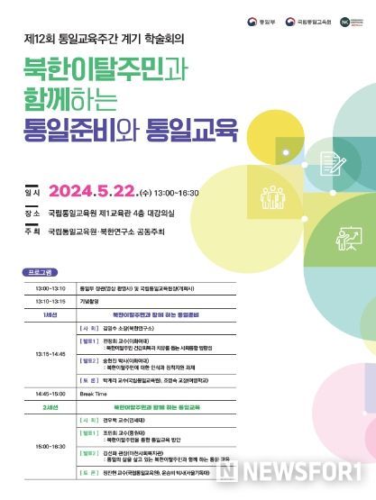 뉴스포원(NEWSFOR1) 윤경덕 기자 | 국립통일교육원은 5월 22일 북한연구소와 공동으로 「북한이탈주민과 함께 하는 통일준비와 통일교육 학술회의」를 개최한다고 밝혔다.
