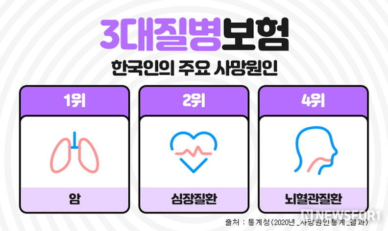 뉴스포원(NEWSFOR1) 윤경덕 기자 | 한국인의 주요 사망원인중에 암, 뇌혈관질환, 심혈관질환은 흔히 3대질병이라 일컬어지며 살아가면서 가장 먼저 대비해야 하는 중대질병으로 항상 강조되고 있다. 이들 질병에 미리 대비하기 위해 가입하는 것이 진단비보험인데, 이러한 3대질병진단비를 중점으로 보장하는 보장성보험이 3대진단비보험 이다. 3대질병진단비보험은 각각의 질병에 주목해서 보장하기도 하지만, 나에게 맞는 추가 특약을 잘 골라서 가입한다면 종합건강보험으로도 충분히 활용도가 높다.