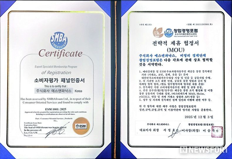 또한 12월3일 .(주)에스앤파낙스(서정호 대표)는 대한민국 소비자평가 단체 창업경영포럼과 전략적제휴 및 우수기업으로 인증 받으며 글로벌 시장으로 발돋움하는 계기를 마련했다.