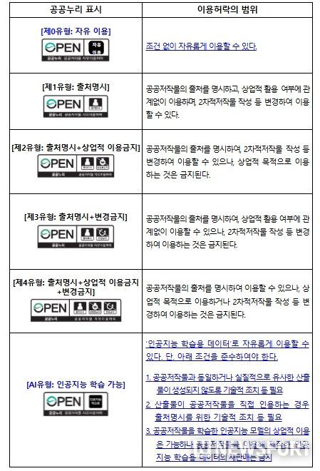 아울러, 기존 공공누리 유형(제1~4유형)의 이용조건은 유지하면서 인공지능(AI) 학습 목적으로는 공공저작물을 자유롭게 활용할 수 있는 ‘인공지능(AI)유형’도 새롭게 마련했다. 기존에 상업적 이용이나 변경 이용이 허용되지 않는 공공저작물이라도 ‘인공지능(AI)유형’을 기존 공공누리 유형과 함께 표시할 경우, 인공지능(AI) 학습에는 자유롭게 활용할 수 있다는 점에서 인공지능(AI) 분야의 활성화를 위해 개방할 수 있는 공공저작물의 범위가 크게 확대될 전망이다.
