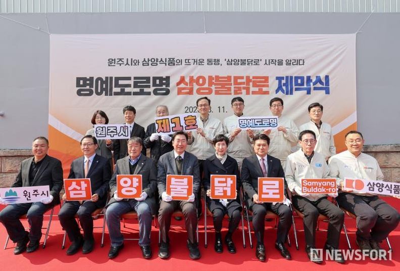 뉴스포원(NEWSFOR1) 윤경덕 기자 | 원주시는 지난 11일 우산동 삼양식품 원주공장 인근에서 원주시 제1호 명예도로명인 ‘삼양불닭로’ 제막식을 열었다. 이날 행사에는 원강수 시장과 김정수 삼양식품 부회장, 김동찬 삼양식품 대표 등 관계자 30여 명이 참석했다.