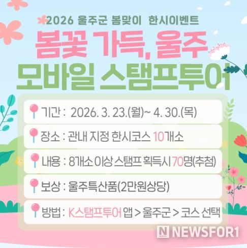 뉴스포원(NEWSFOR1) 윤경덕 기자 | 울산 울주군이 봄을 맞아 오는 23일부터 다음달 30일까지 한시 관광이벤트를 진행한다고 20일 밝혔다.