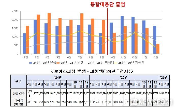 특히, 보이스피싱은 통상적으로 매년 4분기에 이전 분기보다 크게 증가하는 경향이 있었으나(’24년 ㅿ3분기 4,594건 → ㅿ4분기 6,193건, 34.8%↑), 통합대응단이 출범한 ’25년 4분기에는 오히려 이전 3분기보다 27.9% 감소(’25년 ㅿ3분기 6,407건 → ㅿ4분기 4,614건) 하여 ‘연말 피싱 특수’를 처음으로 억제했으며, 통합대응단 체계가 안착한 ’26년 2월에는 전년 동월 대비 발생 건수가 무려 64.5%(1,632건→579건) 감소했다.