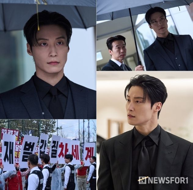 이 가운데, ‘멋진 신세계’ 측이 오는 5월 8일(금) 첫 방송을 앞두고 차갑고 독한 재벌 차세계의 스틸을 공개해 눈길을 끈다. 공개된 스틸에는 회사 앞에서 시위 중인 시위대를 뚫고 나가는 세계의 모습이 담겨 있다. 빈틈없는 올블랙 쓰리피스 슈트핏을 자랑한 그는 계란 투척에도 눈 하나 깜짝하지 않는 냉혹한 카리스마를 드러낸다. 특히 날아오는 계란을 막은 우산 너머로 드러난 세계의 서늘한 눈빛에서 그에게 붙은 ‘악질 재벌’, ‘자본주의가 낳은 괴물’ 등의 ‘악명’을 입증한다.