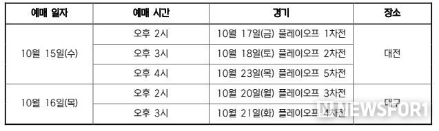 뉴스포원(NEWSFOR1) 편집국 기자 | KBO는 10월 17일(금)부터 열리는 삼성 라이온즈와 한화 이글스의 2025 신한 SOL뱅크 KBO 플레이오프 입장권 예매를 10월 15일(수) 오후 2시부터 진행한다.