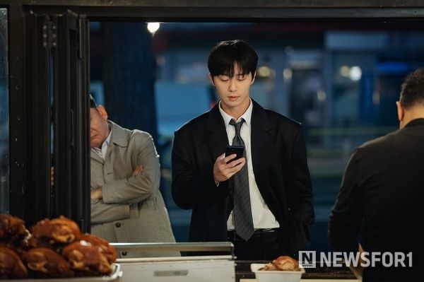 공개된 사진 속에는 일과를 마친 직장인 이경도의 퇴근 현장이 담겨 있다. 살짝 풀린 넥타이가 이경도 캐릭터의 어른미(美)를 더욱 돋보이게 만든다. 퇴근 후에도 휴대폰을 손에서 놓지 않고 계속해서 이슈를 확인하는 이경도의 눈빛에는 일상의 권태로움이 서려 있다.