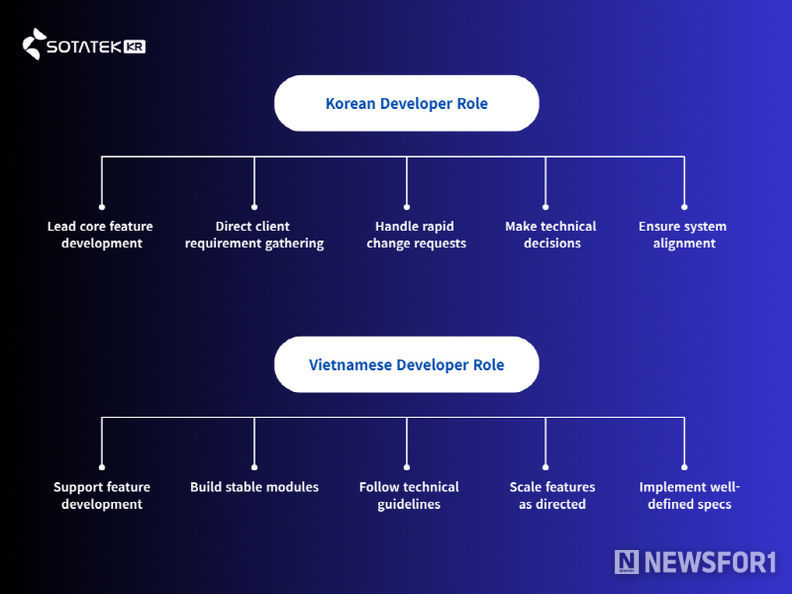 최근 국내 IT 업계에서는 한국 개발자와 베트남 개발자 간의 역할 분담이 더욱 명확해지는 추세다. 한국 개발자들은 핵심 기능 개발을 주도하며, 고객사로부터 요구사항을 직접 수집해 신속하게 대응하는 역할을 맡고 있다. 또한 기술적 의사결정을 수행하고 시스템의 전체적인 방향성을 관리하는 등 프로젝트의 전략적 중심축을 담당한다.
