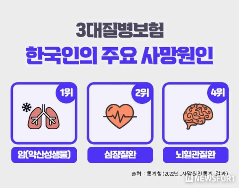 뉴스포원(NEWSFOR1) 윤경덕 기자 | 흔히 3대질병이라 일컫는 암, 심혈관질환, 뇌혈관질환은 통계청 발표자료에 따르면 한국인의 주요 사망원인 중에서 3위 폐렴을 제외하고 1~4위를 차지하고 있으며, 이전부터 지금까지도 살면서 가장 먼저 대비해야 하는 치명적인 질병으로 강조되고 있다. 이러한 중대질병에 대비하기 위하여 상기 세가지 치명적인 질병을 집중보장하는 3대질병진단비보험을 많이 가입하고 있다. 3대진단비보험은 각각의 질병을 중점적으로 보장하면서도 가입자 특성에 맞는 특약을 추가함으로써 종합건강보험으로도 활용할 수가 있다.