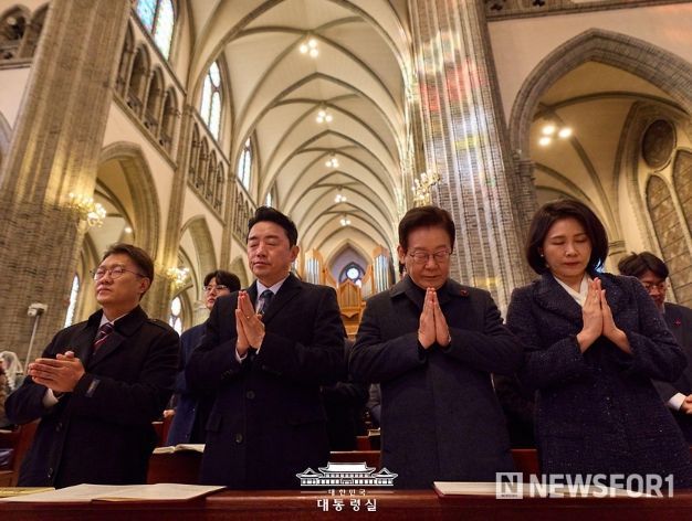뉴스포원(NEWSFOR1) 윤경덕 기자 | 이재명 대통령과 김혜경 여사가 25일 서울 중구 명동대성당에서 열린 성탄 대축일 미사에서 기도를 하고 있다.