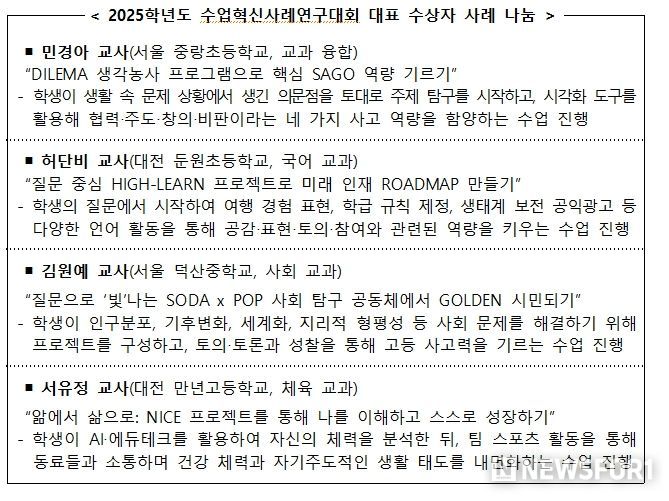 뉴스포원(NEWSFOR1) 윤경덕 기자 | 교육부와 한국교육과정평가원(원장 직무대리 박은아)은 1월 7일, 엘타워(서울)에서 수상자와 교육청 관계자 등이 참석한 가운데 ‘2025학년도 수업혁신사례연구대회 시상식’을 개최한다.