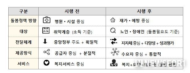 우선 돌봄의 중심이 병원·시설에서 재가·예방으로 옮겨져, 입원·입소 경계선상의 노인·장애인 등이 살던 곳에서 필요한 서비스를 지원받을 수 있게 된다. 소득 기준 중심의 지원에서 벗어나, 노인·장애인의 돌봄 필요도를 기준으로 서비스를 연계해 제공함으로써 사각지대를 줄인다.