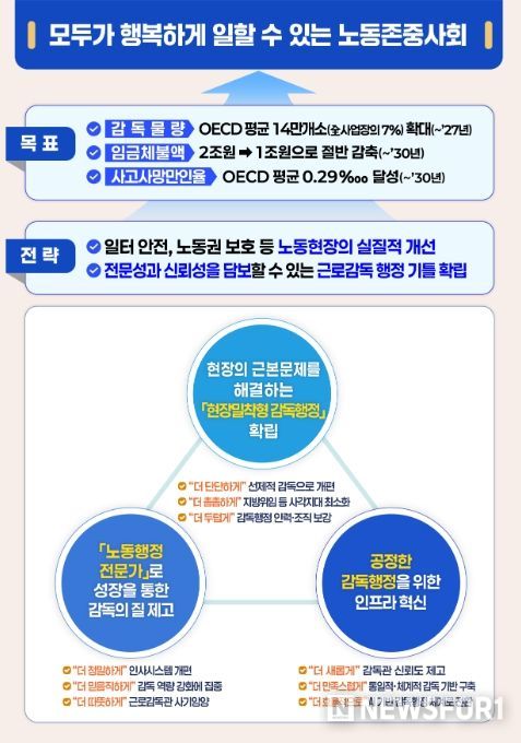 뉴스포원(NEWSFOR1) 윤경덕 기자 | 고용노동부는 1월 14일, 전국 지방고용노동관서 근로기준 및 산업안전 감독관 200여 명이 참석한 '현장 감독관과의 대화'를 개최하여, 국민이 피부로 느낄 수 있는 변화를 핵심으로 하는 '근로감독행정 혁신 방안'을 발표했다.