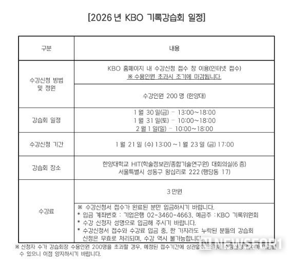 뉴스포원(NEWSFOR1) 편집국 기자 | 2026년 KBO 기록강습회가 1월 30일(금)부터 2월 1일(일)까지 서울 한양대학교에서 개최된다. 기록강습회는 야구 공식기록법의 보급과 이해를 통한 저변 확대를 목적으로 프로야구 원년인 1982년부터 개최됐다.