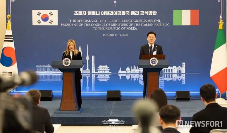 뉴스포원(NEWSFOR1) 윤경덕 기자 | 이재명 대통령은 19일 조르자 멜로니 이탈리아 총리와의 정상회담 뒤 "저와 멜로니 총리는 전략적 동반자 명칭에 부합하는 미래지향적 수준으로 양국 관계를 더욱 발전시켜 나가기로 합의했다"고 밝혔다.