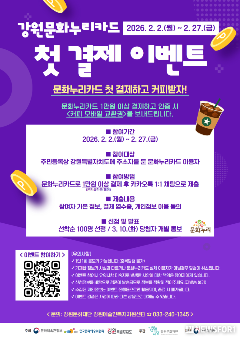 27일(금)까지 문화누리카드로 1만원 이상 결제한 영수증을 인증하면 선착순 100명에게 커피 모바일 교환권을 증정하며, 참여는 강원문화재단 문화누리 카카오톡 채널(pf.kakao.com/_xnYWvn)을 통해 할 수 있다.