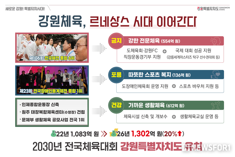 강원특별자치도(도지사 김진태)는 2월 3일(화) 강원체육 르네상스 시대를 이어가기 위한 ‘2026 강원체육 비전’을 발표했다.